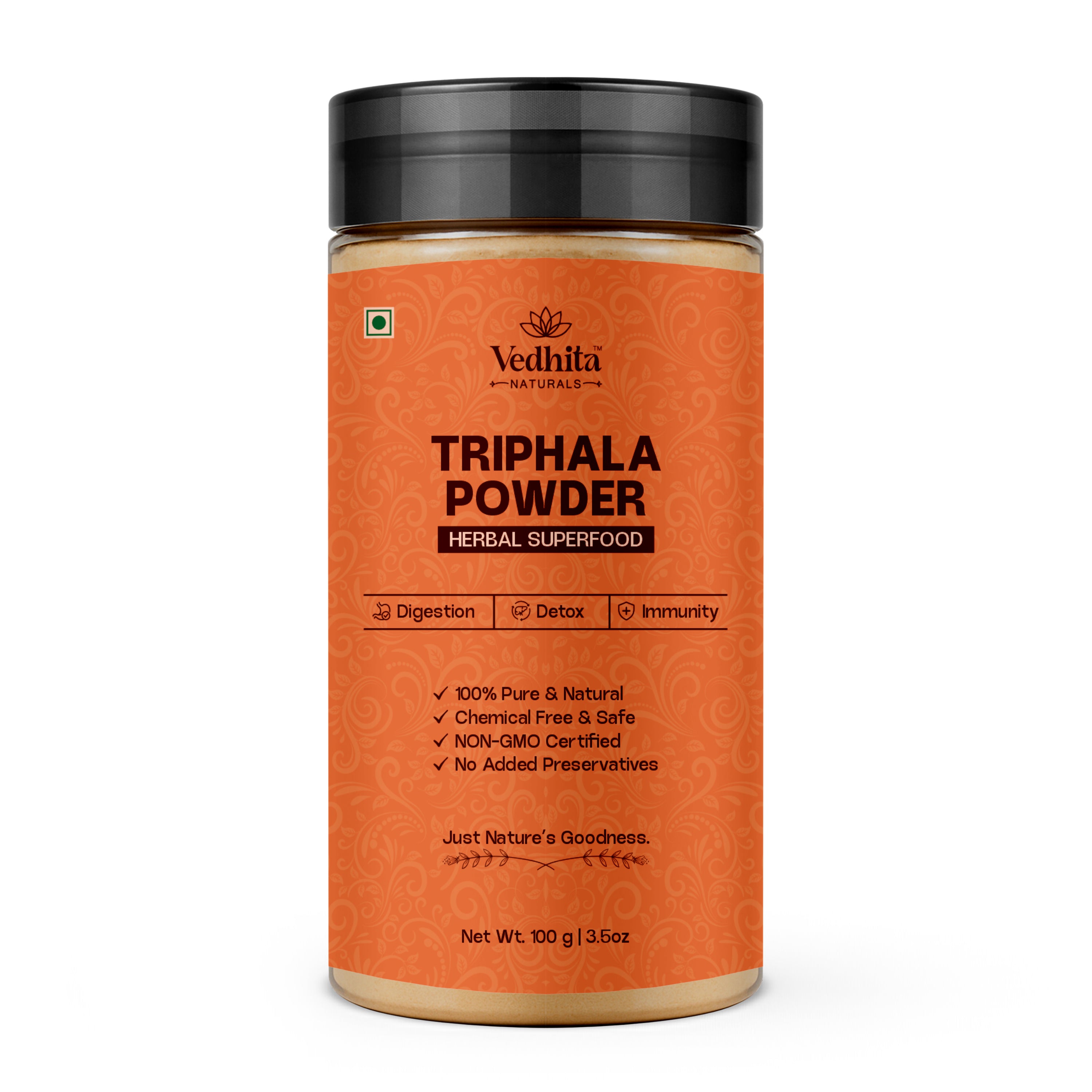Vedhita Naturals Triphala Powder is a pure and natural herbal powder made from high-quality Triphala fruits – Amla, Haritaki, and Bibhitaki.