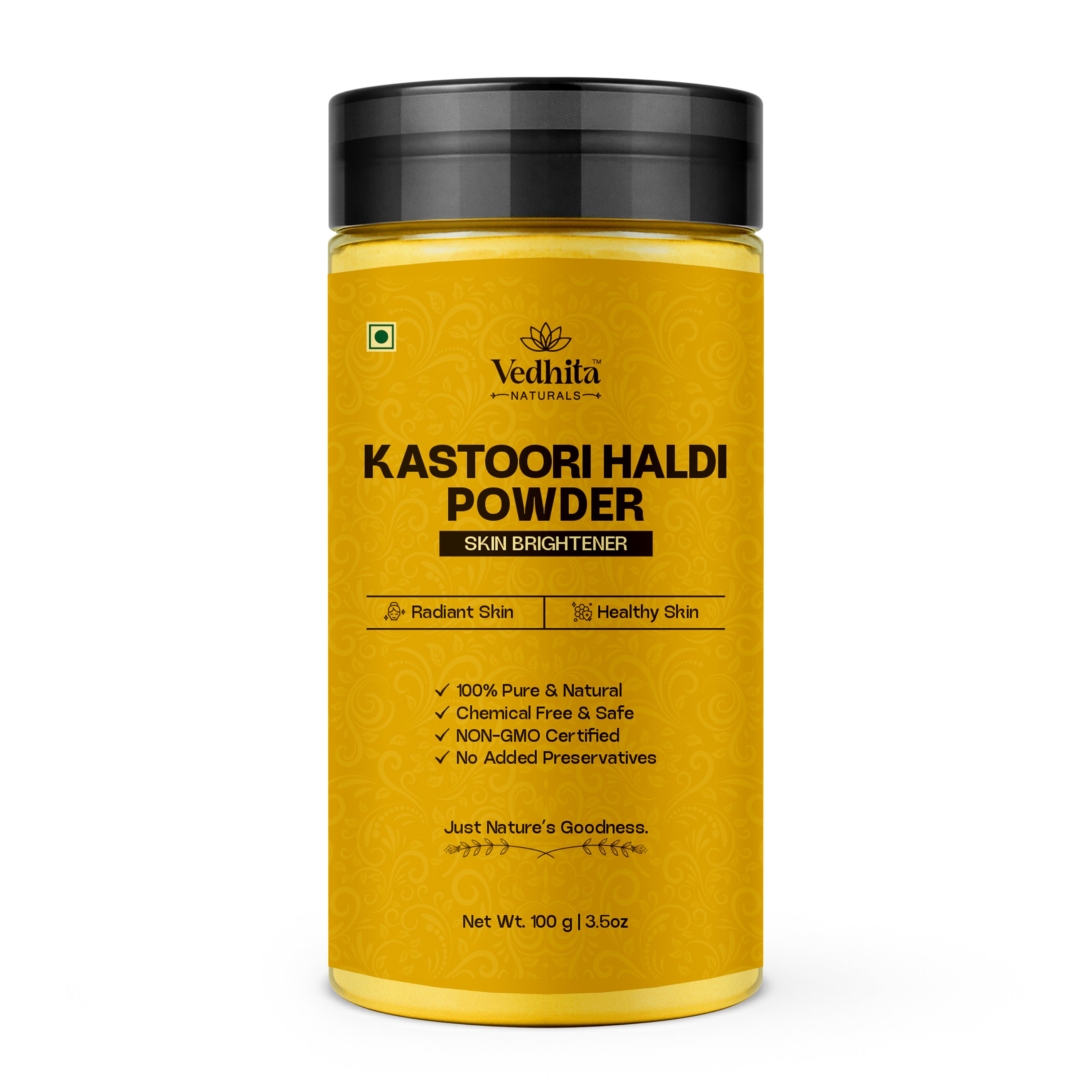 Vedhita Naturals Kastoori Haldi Powder is a pure and natural herbal powder made from high-quality Kastoori Haldi (Wild Turmeric).