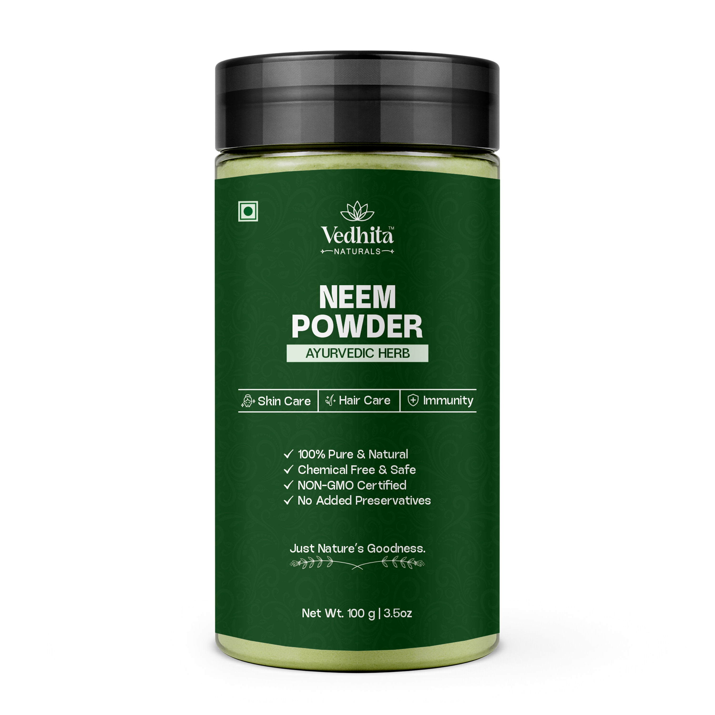 Vedhita Naturals Neem Powder is a pure and natural herbal powder made from high-quality Neem leaves. It can be added to smoothies, juices, or warm water and used occasionally as a natural supplement.